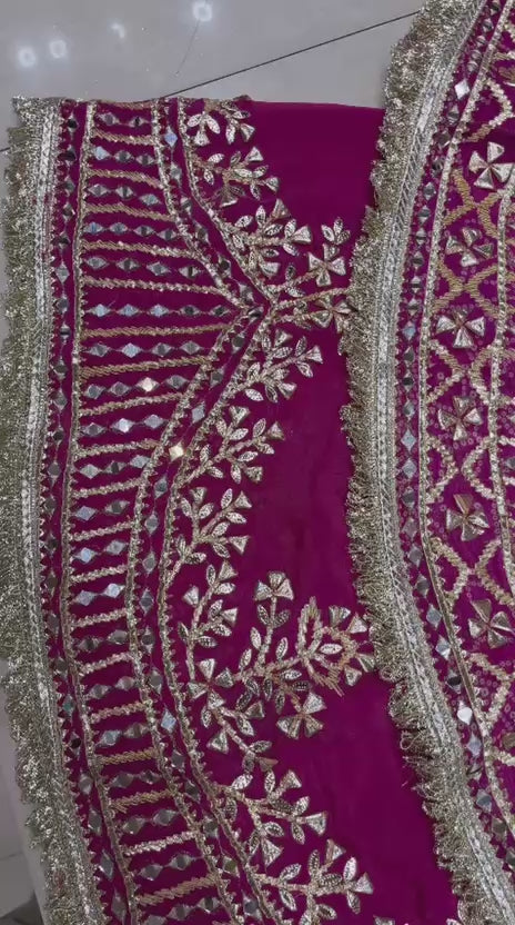 . Beautiful chinnon Dupatta with Four side Mirror and leather buti border Gracing the beauty of Sharara Suit.