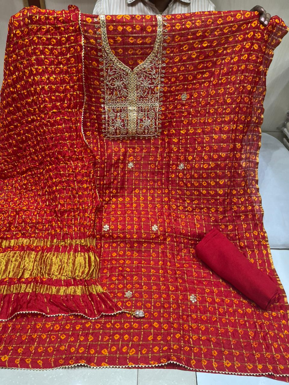 Beautiful unstitched suit set with a very pure gadchola Jaipuri Silk Unstitched fabric top featuring simple and designer Gotta Patti U neckline kundan and pearl highlights.