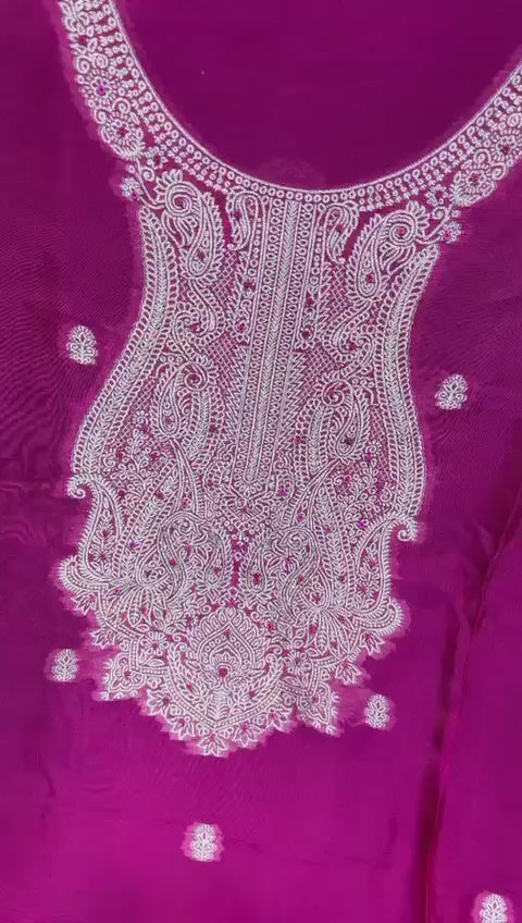 Beautiful Ethnic wear unstitched suit set with Pure and Soft Bangalore Silk Unstitched fabric top featuring Beautiful Banarasi self weaving designer neckline and ghera intricate with sippi highlights.
