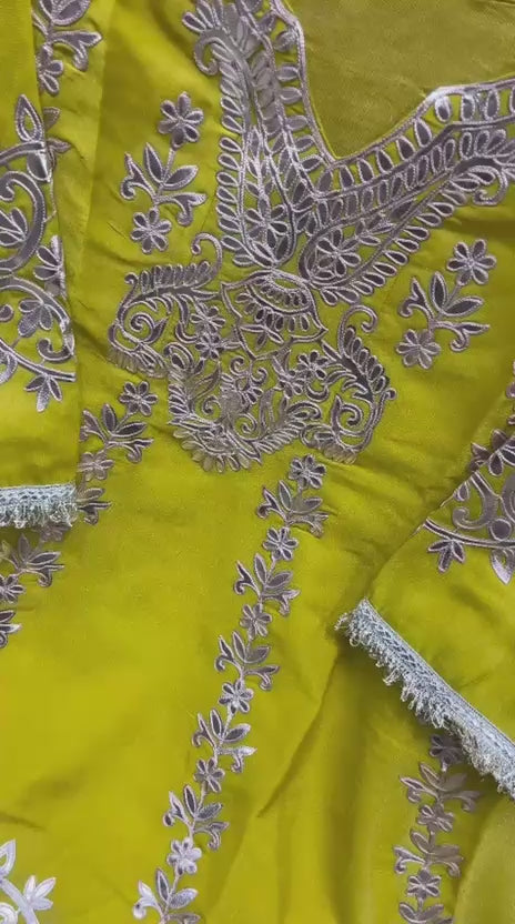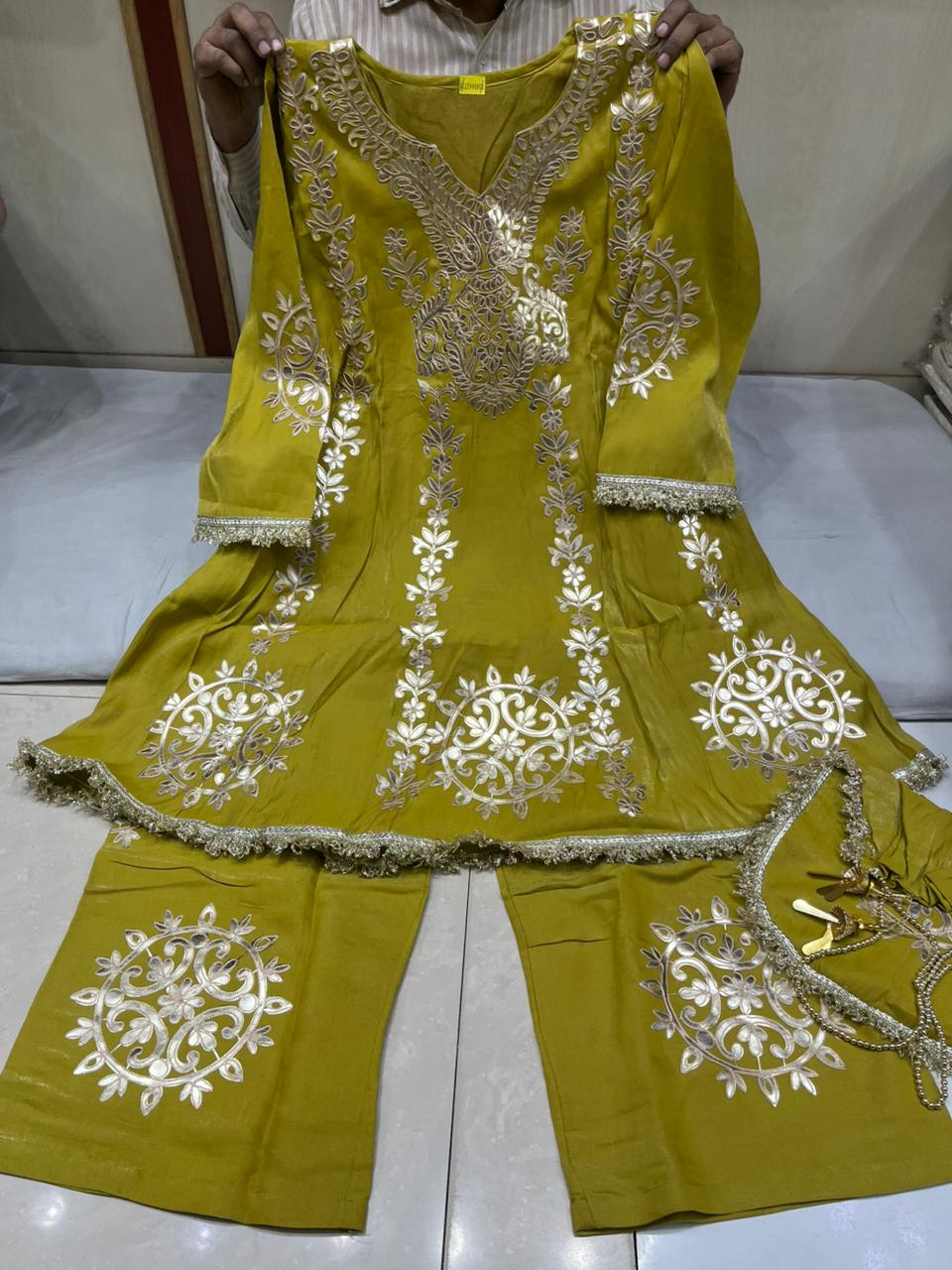 . Simple and elegant Shimmer silk plazo with Leather work .