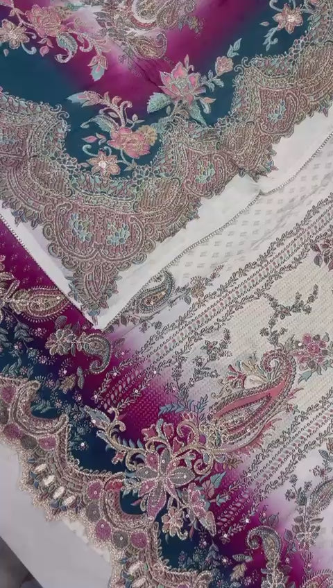 Soft Indian crape shirt with elegant floral and paisely digital prints , enhanced with golden zari , sequins and resham embroidery.