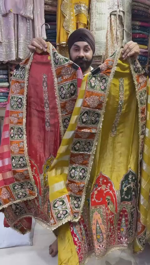 The dupatta made of self stripes tissue fabric four side border heavy rajwada embroidery and kiran lace.