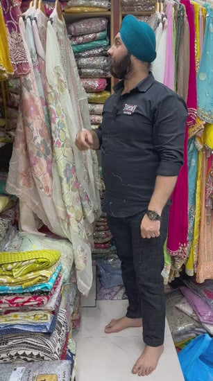 The dupatta is grand and full-sized in matching muslin center panel , digitally printed and finished with embroidered borders on four sides for an elegant frame. The back is plain, sleeves are included, and the set is paired with a fine same color cotton silk bottom for balance and structure. With long length and generous width, it can be stitched into an A-line or traditional Pakistani silhouette comfortably up to 5XL. A festive-ready piece designed for statement occasions.