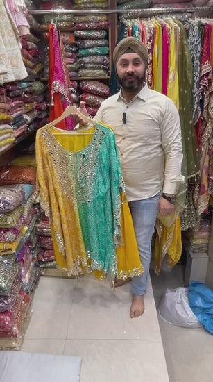 This outfit is a Kaftan Dress with beautiful Garara set featuring a vibrant ombre color.