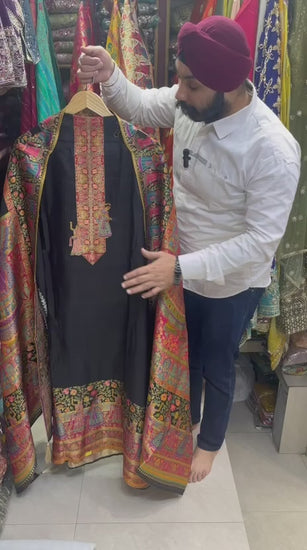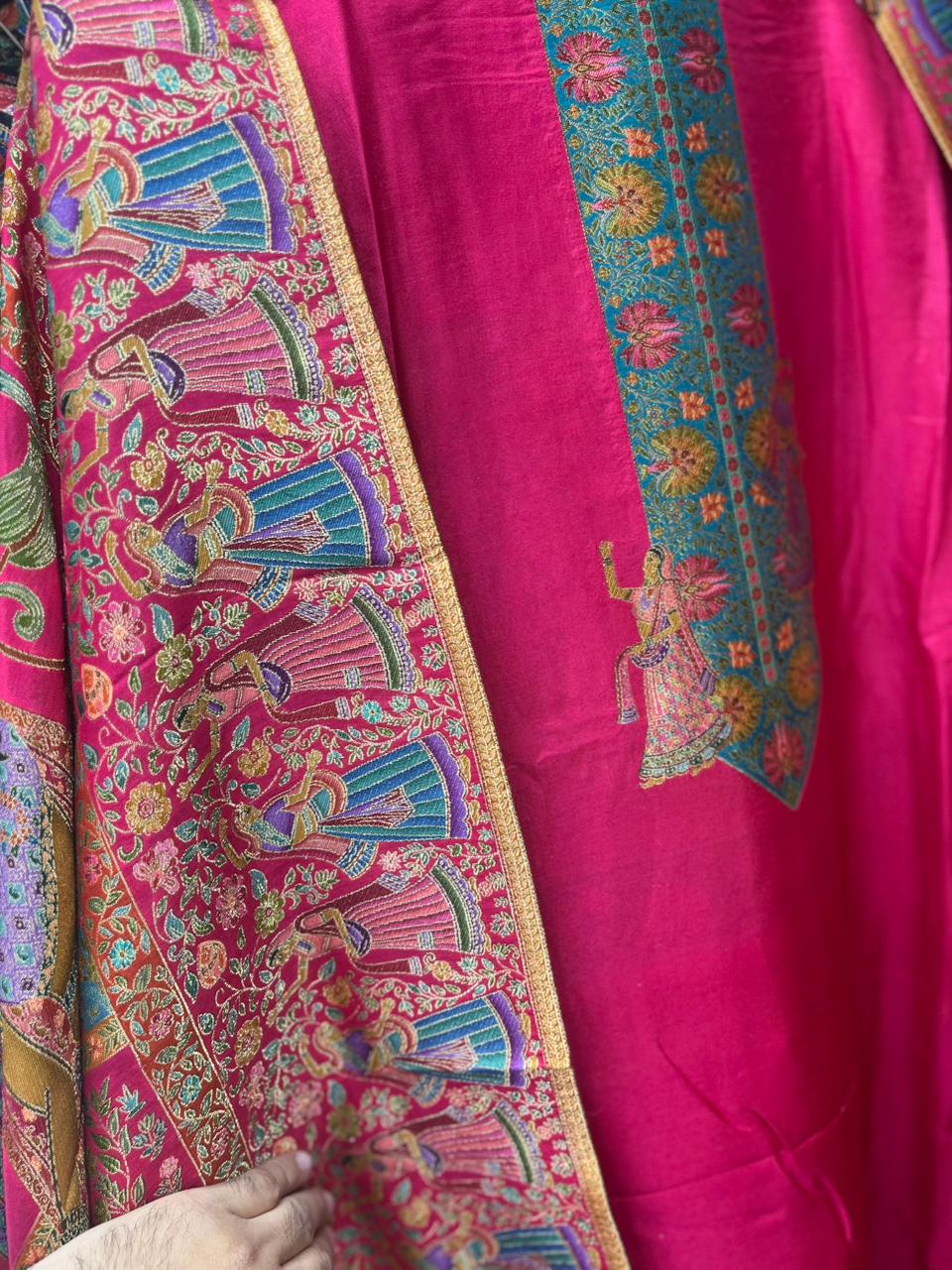 This premium suit is crafted on pure silk jacquard weaving with position printing added only in the weave gaps, giving a clean and rich finish with figure, animal, or human motifs. The originality is clear from the woven backside with its natural silk-zari shine.