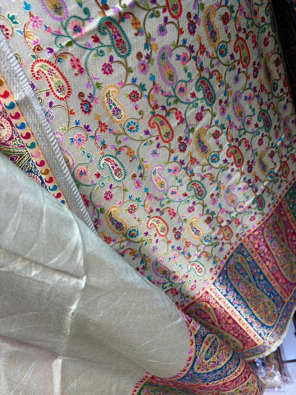 Crafted on a pure and soft silk, this design features original jacquard weave across the fabric, with remaining spaces completed using position printing to create a rich, balanced layout. The highlight is the grand multicolored -style floral paneling that flows beautifully along the front and back of the shirt, with matching detailing on the sleeves for a cohesive, premium look.