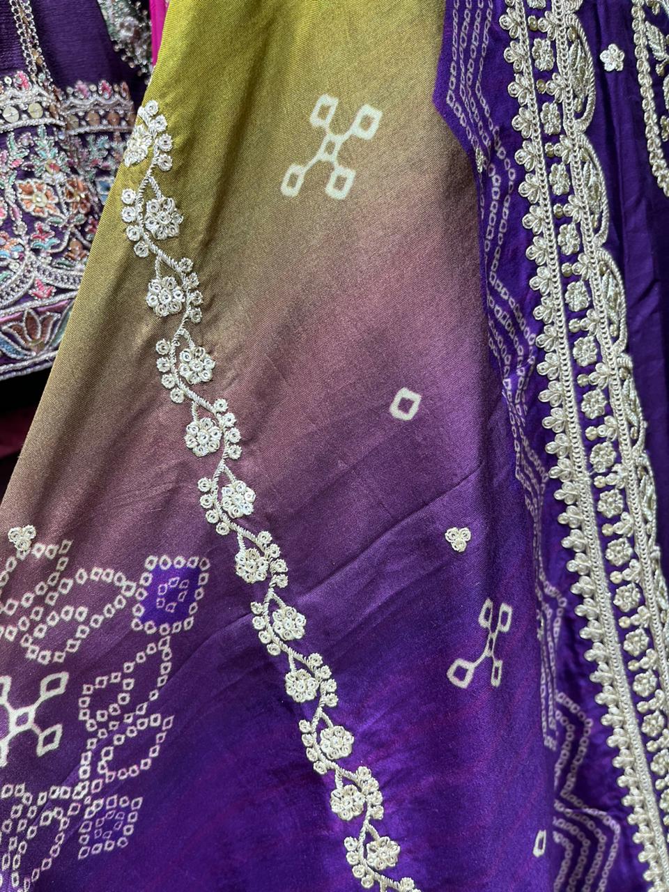 The gorgeous Bandhni dupatta made of self stripes zari sequins embroidery with four side Scalping border heavy.